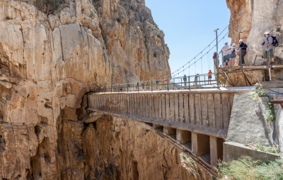 Caminarás por una pasarela peatonal de más de 3 kilómetros construida directamente en las paredes de la garganta de los Gaitanes. Se encuentra a 105 metros de altura en algunas zonas poseyendo un metro de ancho. Llegados a la mitad del camino podréis observar unas vistas más alucinantes si es posible desde un mirador de cristal. Verás la altura a la que te encuentras y todo lo que te rodea con tan solo mirar tus pies. No olvides llevar la cámara de fotos, este momento debe ser inmortalizado. Casi al final del sendero pasarás por un puente colgante donde la adrenalina se apoderará de tu cuerpo. Sabemos que te encantará y querrás pasar una y otra vez, pero lo sentimos, solo podrás hacerlo una única vez por cada visita.